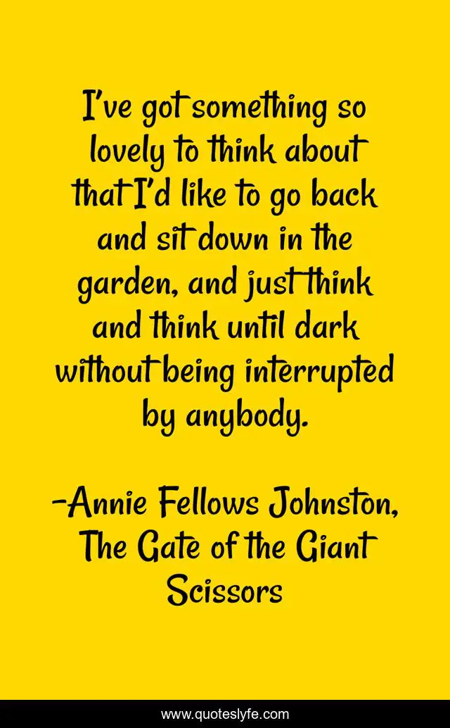 This page presents the quote "I’ve got something so lovely to think about that I’d like to go back and sit down in the garden, and just think and think until dark without being interrupted by anybody.". Author of this quote is Annie Fellows Johnston, The Gate of the Giant Scissors. .