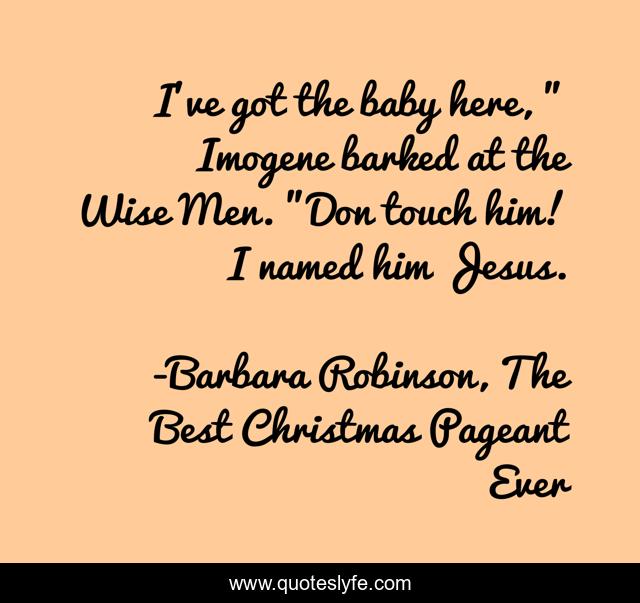 This page presents the quote "I've got the baby here, " Imogene barked at the Wise Men. "Don touch him! I named him Jesus.". Author of this quote is Barbara Robinson, The Best Christmas Pageant Ever. .