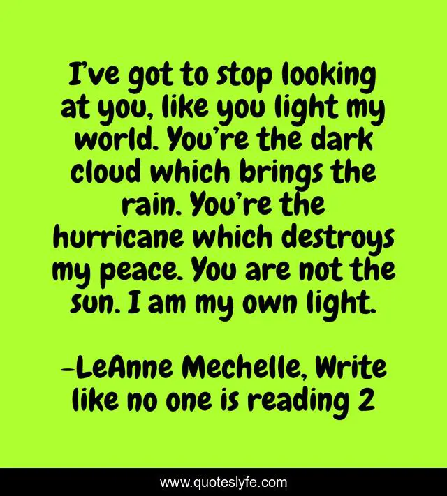 This page presents the quote "I’ve got to stop looking at you, like you light my world. You’re the dark cloud which brings the rain. You’re the hurricane which destroys my peace. You are not the sun. I am my own light.". Author of this quote is LeAnne Mechelle, Write like no one is reading 2. This quote is about dark-cloud, light, peace, hurricane, rain, sun,.