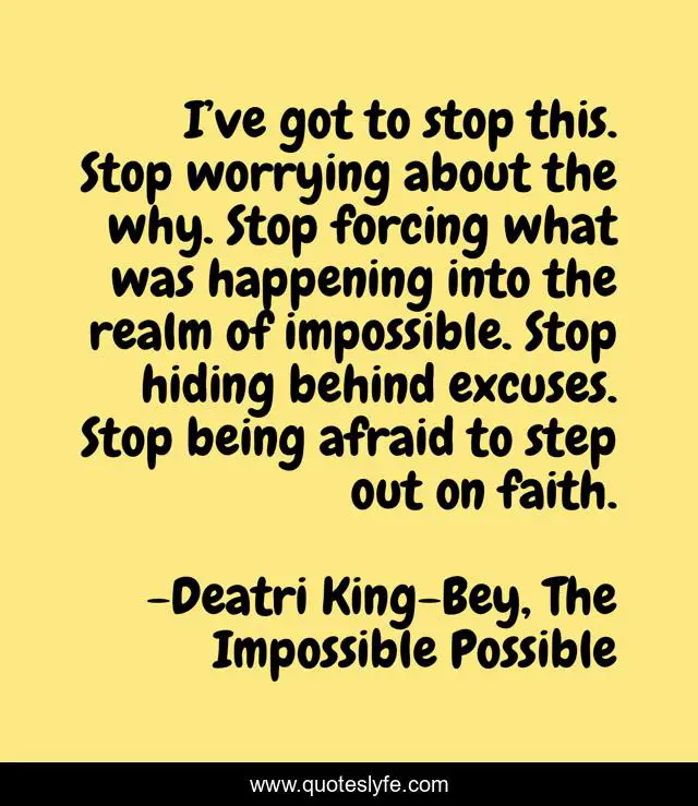 This page presents the quote "I’ve got to stop this. Stop worrying about the why. Stop forcing what was happening into the realm of impossible. Stop hiding behind excuses. Stop being afraid to step out on faith.". Author of this quote is Deatri King-Bey, The Impossible Possible. This quote is about excuses, worry, faith,.