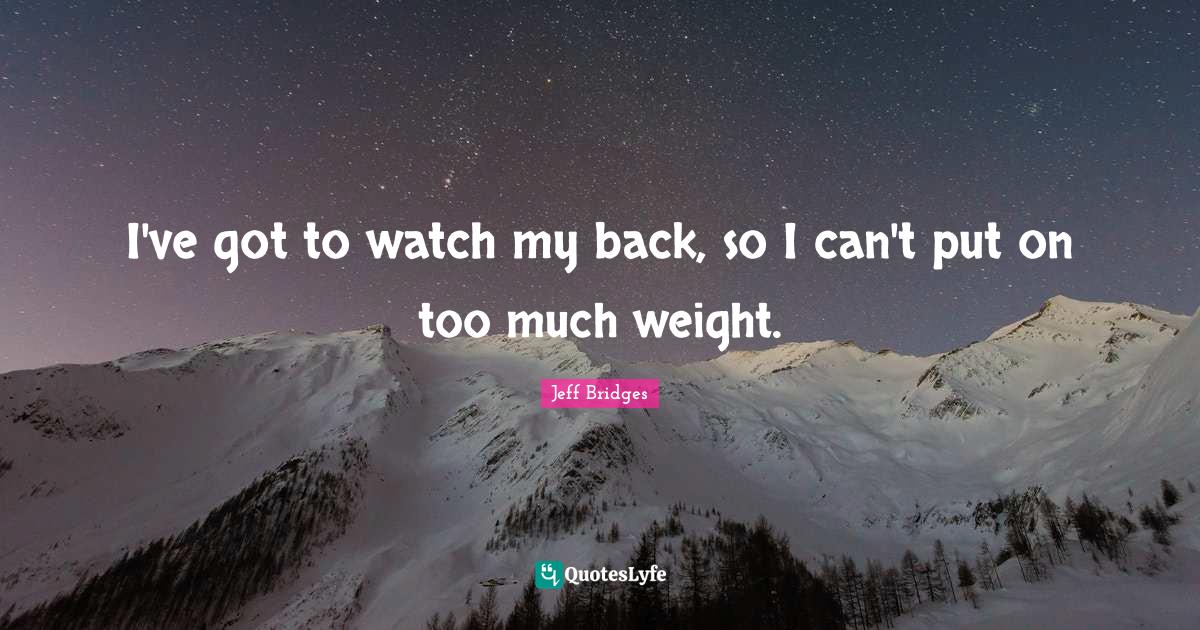 This page presents the quote "I've got to watch my back, so I can't put on too much weight.". Author of this quote is Jeff Bridges. This quote is about watches, too much, i can, weight,.