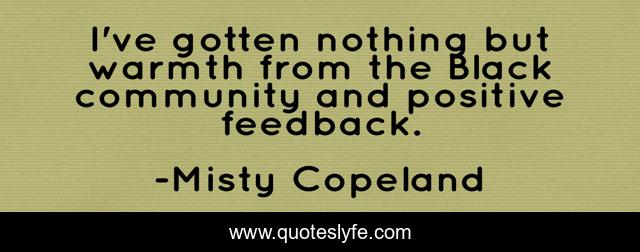 This page presents the quote "I've gotten nothing but warmth from the Black community and positive feedback.". Author of this quote is Misty Copeland. This quote is about black, feedback, community,.