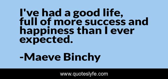 This page presents the quote "I've had a good life, full of more success and happiness than I ever expected.". Author of this quote is Maeve Binchy. This quote is about life, good, success,.