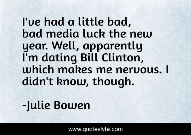 This page presents the quote "I've had a little bad, bad media luck the new year. Well, apparently I'm dating Bill Clinton, which makes me nervous. I didn't know, though.". Author of this quote is Julie Bowen. This quote is about me, media, luck,.