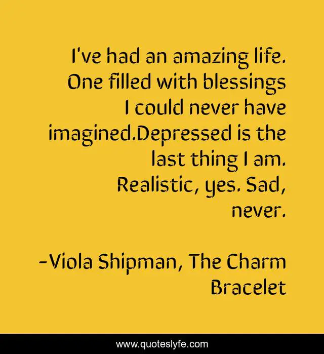This page presents the quote "I've had an amazing life. One filled with blessings I could never have imagined.Depressed is the last thing I am. Realistic, yes. Sad, never.". Author of this quote is Viola Shipman, The Charm Bracelet. This quote is about love, alzheimers, courage, elderly, life-lessons, family-relationships, affection,.