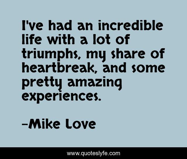 This page presents the quote "I've had an incredible life with a lot of triumphs, my share of heartbreak, and some pretty amazing experiences.". Author of this quote is Mike Love. This quote is about life, heartbreak,.
