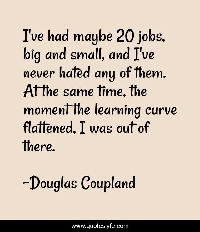 This page presents the quote "I've had maybe 20 jobs, big and small, and I've never hated any of them. At the same time, the moment the learning curve flattened, I was out of there.". Author of this quote is Douglas Coupland. This quote is about small, moment, time,.