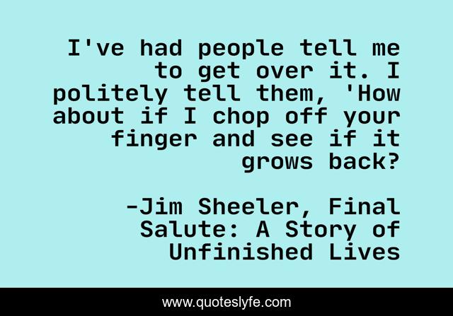 This page presents the quote "I've had people tell me to get over it. I politely tell them, 'How about if I chop off your finger and see if it grows back?". Author of this quote is Jim Sheeler, Final Salute: A Story of Unfinished Lives. This quote is about loss, death, sacrifice, grief, soldier, mother, military, marines, iraq,.