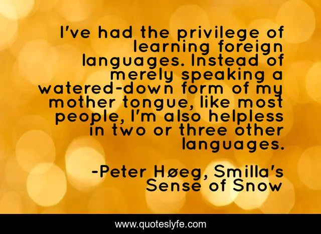 This page presents the quote "I've had the privilege of learning foreign languages. Instead of merely speaking a watered-down form of my mother tongue, like most people, I'm also helpless in two or three other languages.". Author of this quote is Peter Høeg, Smilla's Sense of Snow. .