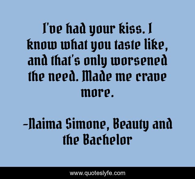 This page presents the quote "I’ve had your kiss. I know what you taste like, and that’s only worsened the need. Made me crave more.". Author of this quote is Naima Simone, Beauty and the Bachelor. This quote is about contemporary-romance, millionaire-hero, revenge, blackmail,.