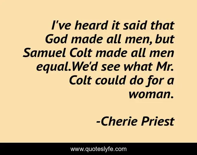 This page presents the quote "I've heard it said that God made all men, but Samuel Colt made all men equal.We'd see what Mr. Colt could do for a woman.". Author of this quote is Cherie Priest. This quote is about guns, feminism,.