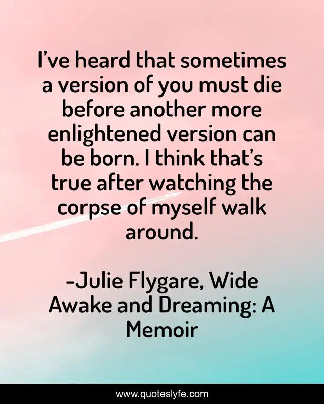 This page presents the quote "I’ve heard that sometimes a version of you must die before another more enlightened version can be born. I think that’s true after watching the corpse of myself walk around.". Author of this quote is Julie Flygare, Wide Awake and Dreaming: A Memoir. This quote is about awakening, narcolepsy, awake, inspirational, enthusiasm, enlightened, enlightenment, waking-up, memoir,.