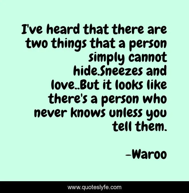 This page presents the quote "I've heard that there are two things that a person simply cannot hide.Sneezes and love..But it looks like there's a person who never knows unless you tell them.". Author of this quote is Waroo. This quote is about cute, heartwarming,.