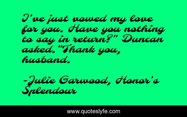 This page presents the quote "I've just vowed my love for you. Have you nothing to say in return?" Duncan asked."Thank you, husband.". Author of this quote is Julie Garwood, Honor's Splendour. This quote is about romance, humor, julie-garwood, honor-s-splendour,.
