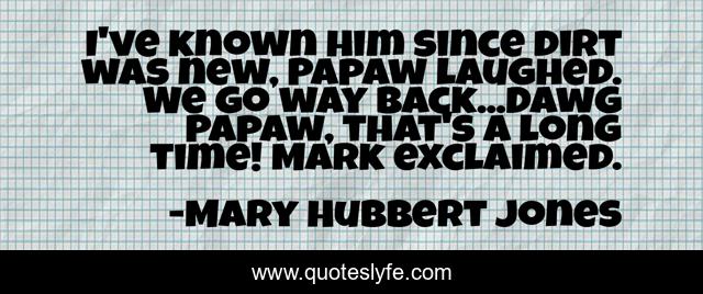 This page presents the quote "I've known him since dirt was new, Papaw laughed. We go way back...Dawg Papaw, that's a long time! Mark exclaimed.". Author of this quote is Mary Hubbert Jones. .