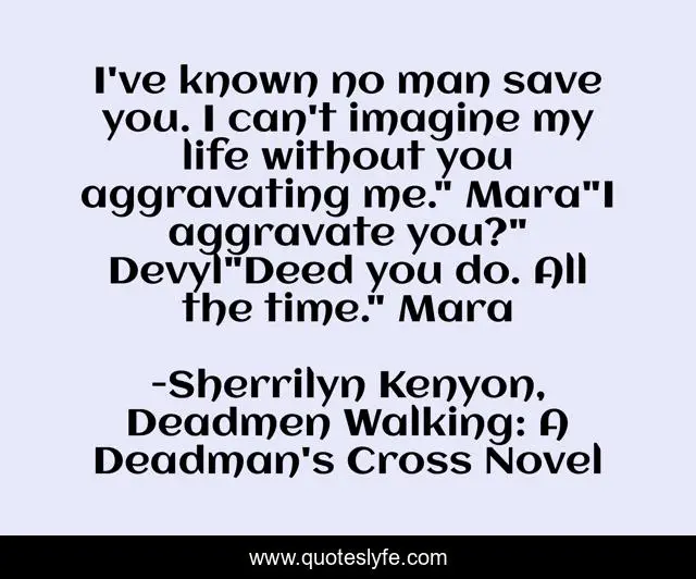 This page presents the quote "I've known no man save you. I can't imagine my life without you aggravating me." Mara"I aggravate you?" Devyl"Deed you do. All the time." Mara". Author of this quote is Sherrilyn Kenyon, Deadmen Walking: A Deadman's Cross Novel. .