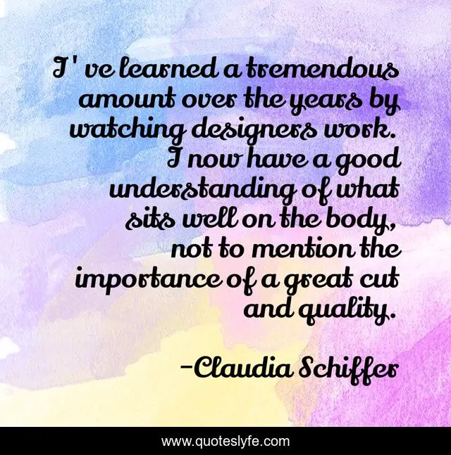 This page presents the quote "I've learned a tremendous amount over the years by watching designers work. I now have a good understanding of what sits well on the body, not to mention the importance of a great cut and quality.". Author of this quote is Claudia Schiffer. This quote is about work, great, good,.