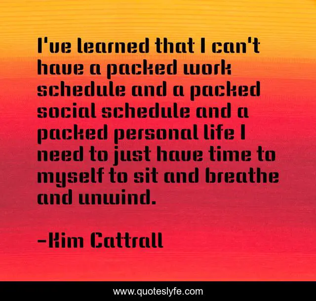 This page presents the quote "I've learned that I can't have a packed work schedule and a packed social schedule and a packed personal life I need to just have time to myself to sit and breathe and unwind.". Author of this quote is Kim Cattrall. This quote is about life, myself, time,.