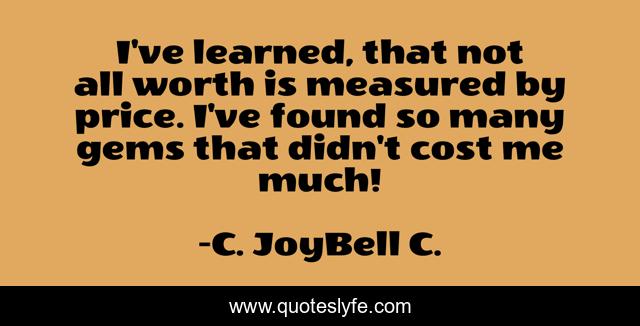 This page presents the quote "I've learned, that not all worth is measured by price. I've found so many gems that didn't cost me much!". Author of this quote is C. JoyBell C.. This quote is about the-cost-of-worth, inspirational, the-cost-of-value, enthusiasm, worth-and-cost, worth,.