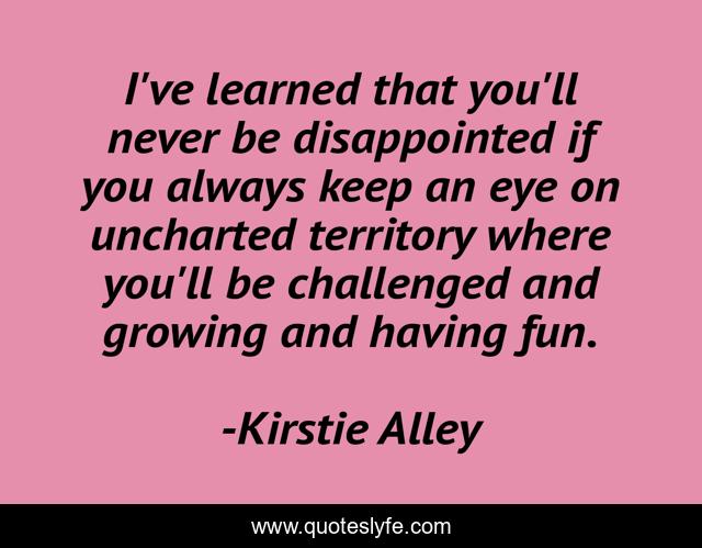 This page presents the quote "I've learned that you'll never be disappointed if you always keep an eye on uncharted territory where you'll be challenged and growing and having fun.". Author of this quote is Kirstie Alley. .