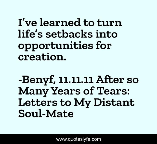 This page presents the quote "I’ve learned to turn life’s setbacks into opportunities for creation.". Author of this quote is Benyf, 11.11.11 After so Many Years of Tears: Letters to My Distant Soul-Mate. This quote is about broken-heart, setbacks, creation, healing, change,.