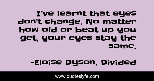 This page presents the quote "I’ve learnt that eyes don't change. No matter how old or beat up you get, your eyes stay the same.". Author of this quote is Eloise Dyson, Divided. This quote is about divided, eyes,.