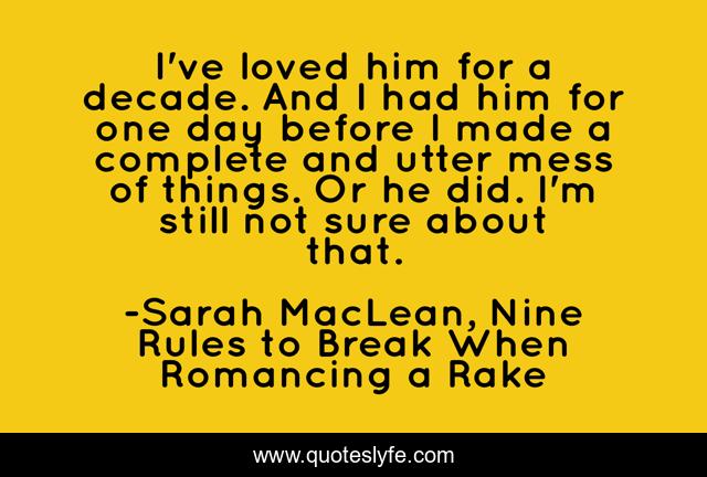 This page presents the quote "I've loved him for a decade. And I had him for one day before I made a complete and utter mess of things. Or he did. I'm still not sure about that.". Author of this quote is Sarah MacLean, Nine Rules to Break When Romancing a Rake. This quote is about romance, humor,.