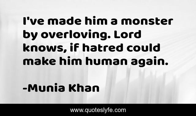 This page presents the quote "I've made him a monster by overloving. Lord knows, if hatred could make him human again.". Author of this quote is Munia Khan. This quote is about again, made, love, monster, make, overlove, human, love-hurts, hatred,.