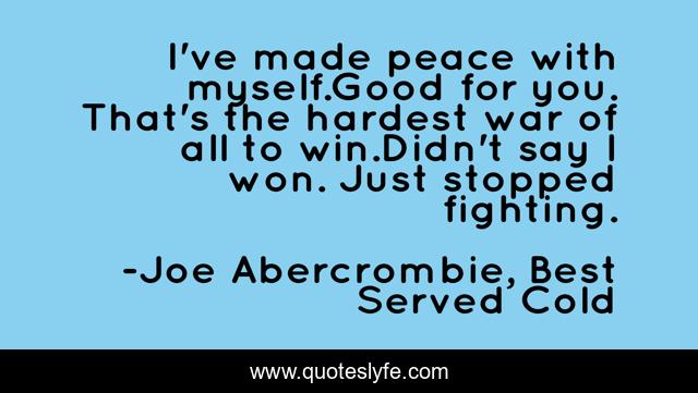 This page presents the quote "I've made peace with myself.Good for you. That's the hardest war of all to win.Didn't say I won. Just stopped fighting.". Author of this quote is Joe Abercrombie, Best Served Cold. This quote is about mercenary, resignation, inner-peace,.