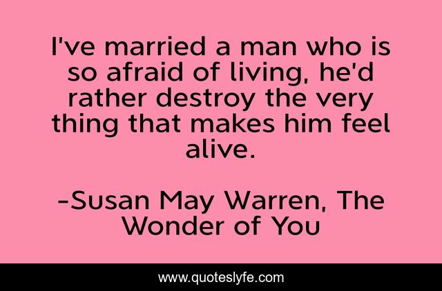 This page presents the quote "I’ve married a man who is so afraid of living, he’d rather destroy the very thing that makes him feel alive.". Author of this quote is Susan May Warren, The Wonder of You. This quote is about living, afraid, marriage,.
