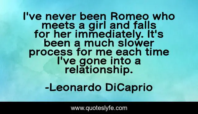 This page presents the quote "I've never been Romeo who meets a girl and falls for her immediately. It's been a much slower process for me each time I've gone into a relationship.". Author of this quote is Leonardo DiCaprio. This quote is about girl, relationship, time,.