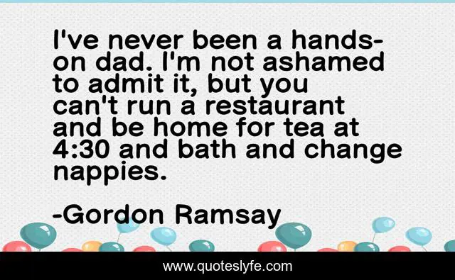 This page presents the quote "I've never been a hands-on dad. I'm not ashamed to admit it, but you can't run a restaurant and be home for tea at 4:30 and bath and change nappies.". Author of this quote is Gordon Ramsay. This quote is about tea, change, restaurant,.