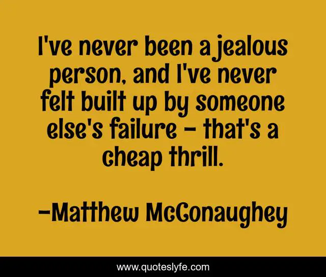This page presents the quote "I've never been a jealous person, and I've never felt built up by someone else's failure - that's a cheap thrill.". Author of this quote is Matthew McConaughey. This quote is about jealous, person,.
