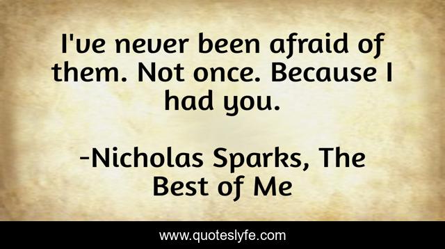 This page presents the quote "I've never been afraid of them. Not once. Because I had you.". Author of this quote is Nicholas Sparks, The Best of Me. This quote is about true-love, love, nicholas-sparks, amanda-colier, dawson-cole, happiness, affection,.