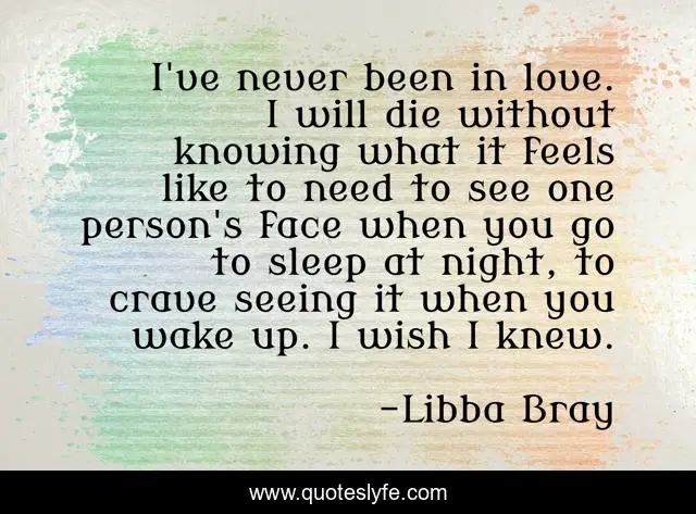This page presents the quote "I've never been in love. I will die without knowing what it feels like to need to see one person's face when you go to sleep at night, to crave seeing it when you wake up. I wish I knew.". Author of this quote is Libba Bray. This quote is about heartache, death, love, affection,.