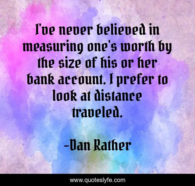 This page presents the quote "I've never believed in measuring one's worth by the size of his or her bank account. I prefer to look at distance traveled.". Author of this quote is Dan Rather. This quote is about quote, dan-rather, quotes,.
