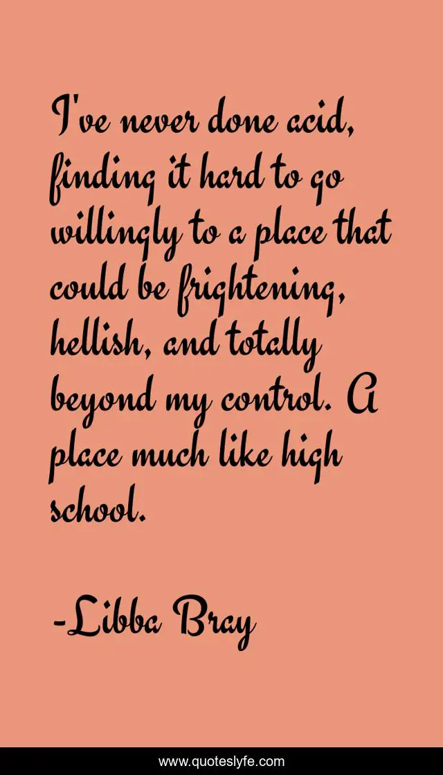 This page presents the quote "I've never done acid, finding it hard to go willingly to a place that could be frightening, hellish, and totally beyond my control. A place much like high school.". Author of this quote is Libba Bray. This quote is about hell, school, education, going-bovine,.