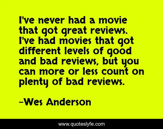 This page presents the quote "I've never had a movie that got great reviews. I've had movies that got different levels of good and bad reviews, but you can more or less count on plenty of bad reviews.". Author of this quote is Wes Anderson. This quote is about great, good, good and bad,.