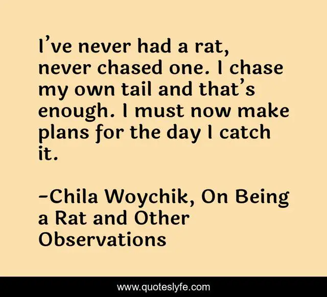 This page presents the quote "I’ve never had a rat, never chased one. I chase my own tail and that’s enough. I must now make plans for the day I catch it.". Author of this quote is Chila Woychik, On Being a Rat and Other Observations. This quote is about metaphor, metaphorical, rats, writing,.