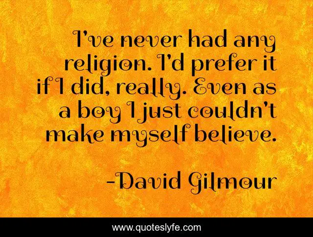 This page presents the quote "I've never had any religion. I'd prefer it if I did, really. Even as a boy I just couldn't make myself believe.". Author of this quote is David Gilmour. This quote is about boy, myself, believe,.