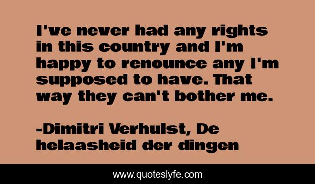 This page presents the quote "I've never had any rights in this country and I'm happy to renounce any I'm supposed to have. That way they can't bother me.". Author of this quote is Dimitri Verhulst, De helaasheid der dingen. .
