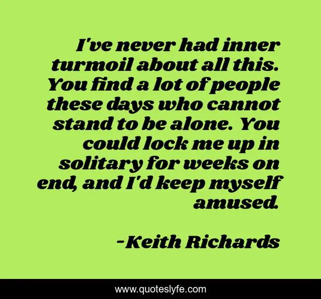 This page presents the quote "I've never had inner turmoil about all this. You find a lot of people these days who cannot stand to be alone. You could lock me up in solitary for weeks on end, and I'd keep myself amused.". Author of this quote is Keith Richards. .
