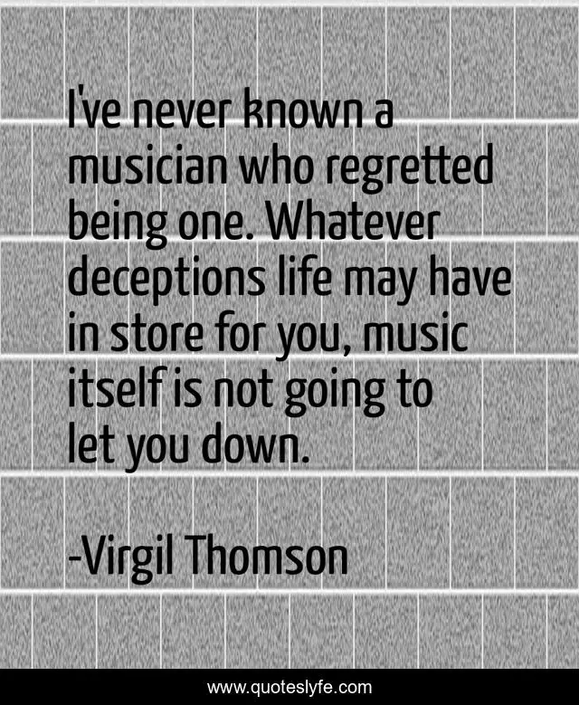 This page presents the quote "I've never known a musician who regretted being one. Whatever deceptions life may have in store for you, music itself is not going to let you down.". Author of this quote is Virgil Thomson. .