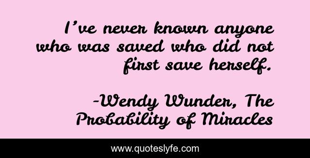 This page presents the quote "I’ve never known anyone who was saved who did not first save herself.". Author of this quote is Wendy Wunder, The Probability of Miracles. This quote is about life, life-and-death, truth,.