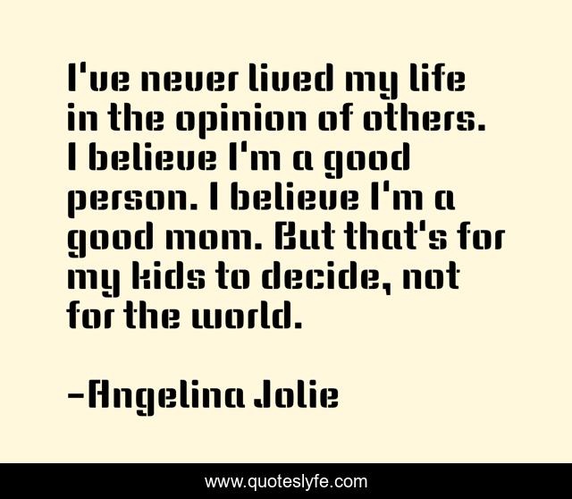 This page presents the quote "I've never lived my life in the opinion of others. I believe I'm a good person. I believe I'm a good mom. But that's for my kids to decide, not for the world.". Author of this quote is Angelina Jolie. This quote is about world, life, good,.