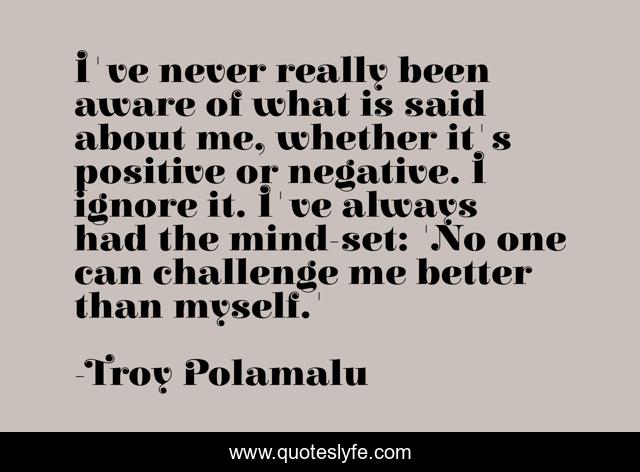 This page presents the quote "I've never really been aware of what is said about me, whether it's positive or negative. I ignore it. I've always had the mind-set: 'No one can challenge me better than myself.'". Author of this quote is Troy Polamalu. This quote is about me, myself, challenge,.