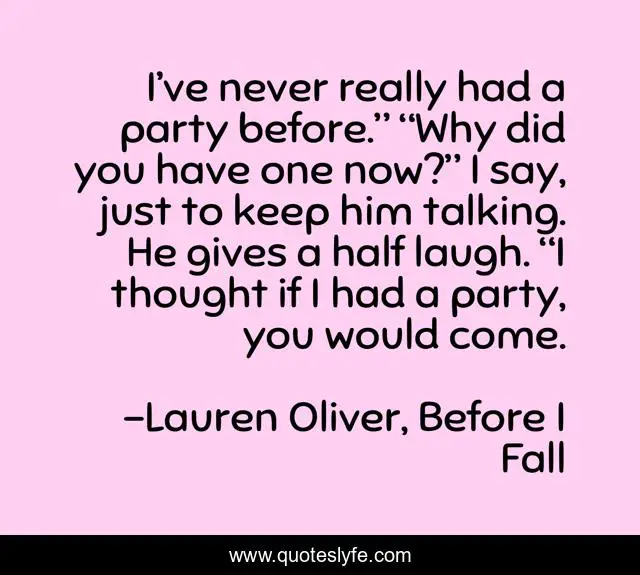 This page presents the quote "I’ve never really had a party before.” “Why did you have one now?” I say, just to keep him talking. He gives a half laugh. “I thought if I had a party, you would come.". Author of this quote is Lauren Oliver, Before I Fall. This quote is about cute, awe, love-story,.