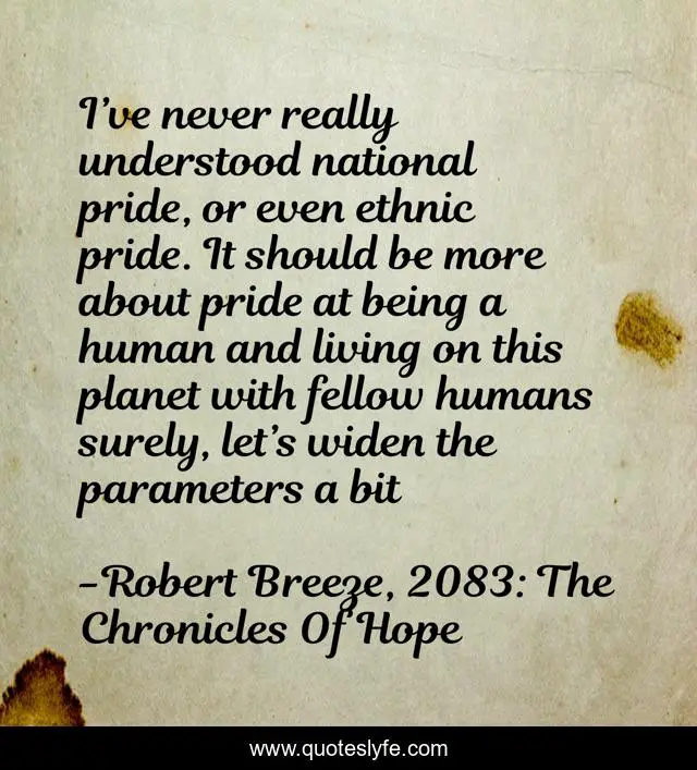 This page presents the quote "I’ve never really understood national pride, or even ethnic pride. It should be more about pride at being a human and living on this planet with fellow humans surely, let’s widen the parameters a bit". Author of this quote is Robert Breeze, 2083: The Chronicles Of Hope. This quote is about nationalism, patriotism,.