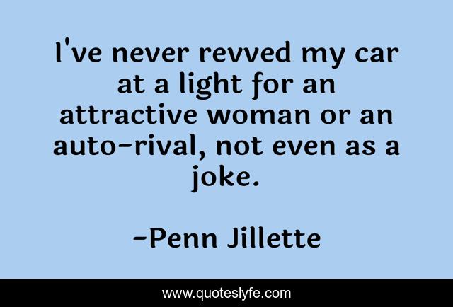 This page presents the quote "I've never revved my car at a light for an attractive woman or an auto-rival, not even as a joke.". Author of this quote is Penn Jillette. This quote is about light, woman,.