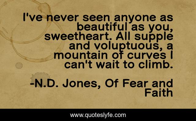 This page presents the quote "I've never seen anyone as beautiful as you, sweetheart. All supple and voluptuous, a mountain of curves I can't wait to climb.". Author of this quote is N.D. Jones, Of Fear and Faith. This quote is about african-american-books, romance, nd-jones, contemporary-romance, paranormal-romance,.